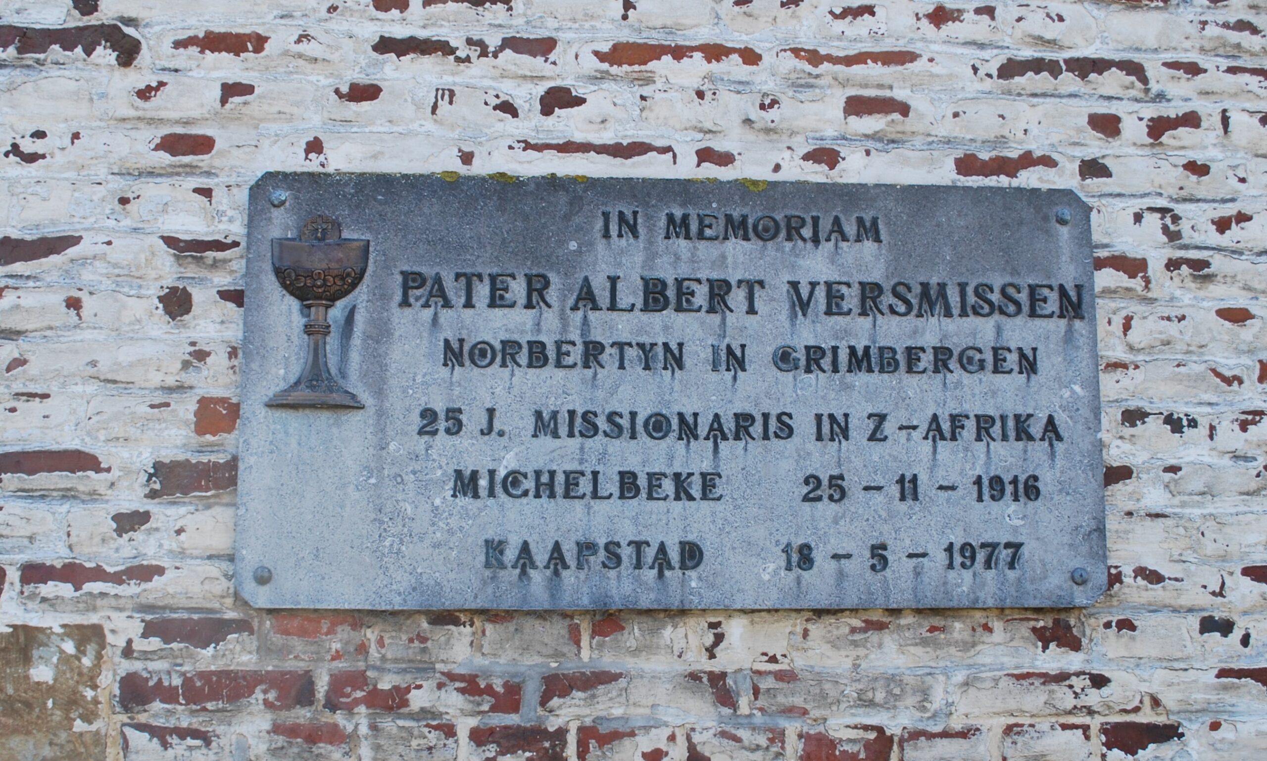 De gedenkplaat in blauwe hardsteen is bevestigd op de koorgevel. Op de plaat is een goudkleurige kelk met hostie afgebeeld met de tekst: “IN MEMORIAM / PATER ALBERT VERSMISSEN / NORBERTYN IN GRIMBERGEN / 25 J. MISSIONARIS IN Z-AFRIKA / MICHELBEKE 25-11-1916 / KAAPSTAD 18-5-1977”