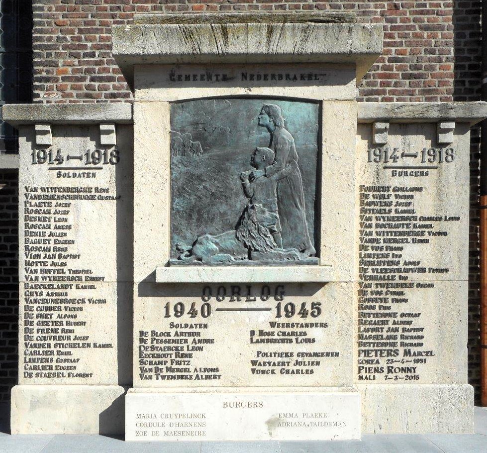 Het oorlogsmonument werd in 1921, waarschijnlijk naar aanleiding van 11 november, ter herinnering aan de Brakelse gesneuvelden uit de beide wereldoorlogenn opgericht. Naast de gesneuvelden van de oorlogen 1914-1918 en 1940-1945 staan ook de namen van de afgestorven opgeëisten, politieke gevangenen en burgerlijke slachtoffers. Op de bronzen plaat zien we een afbeelding van een ‘oorlogsonweer’ met op het voorplan een vrouw die angstvallig haar kind beschermd naast de wakende leeuw van België. Aan beide zijden en onderaan het monument staan de namen van de afgestorven oorlogsslachtoffers vermeld.